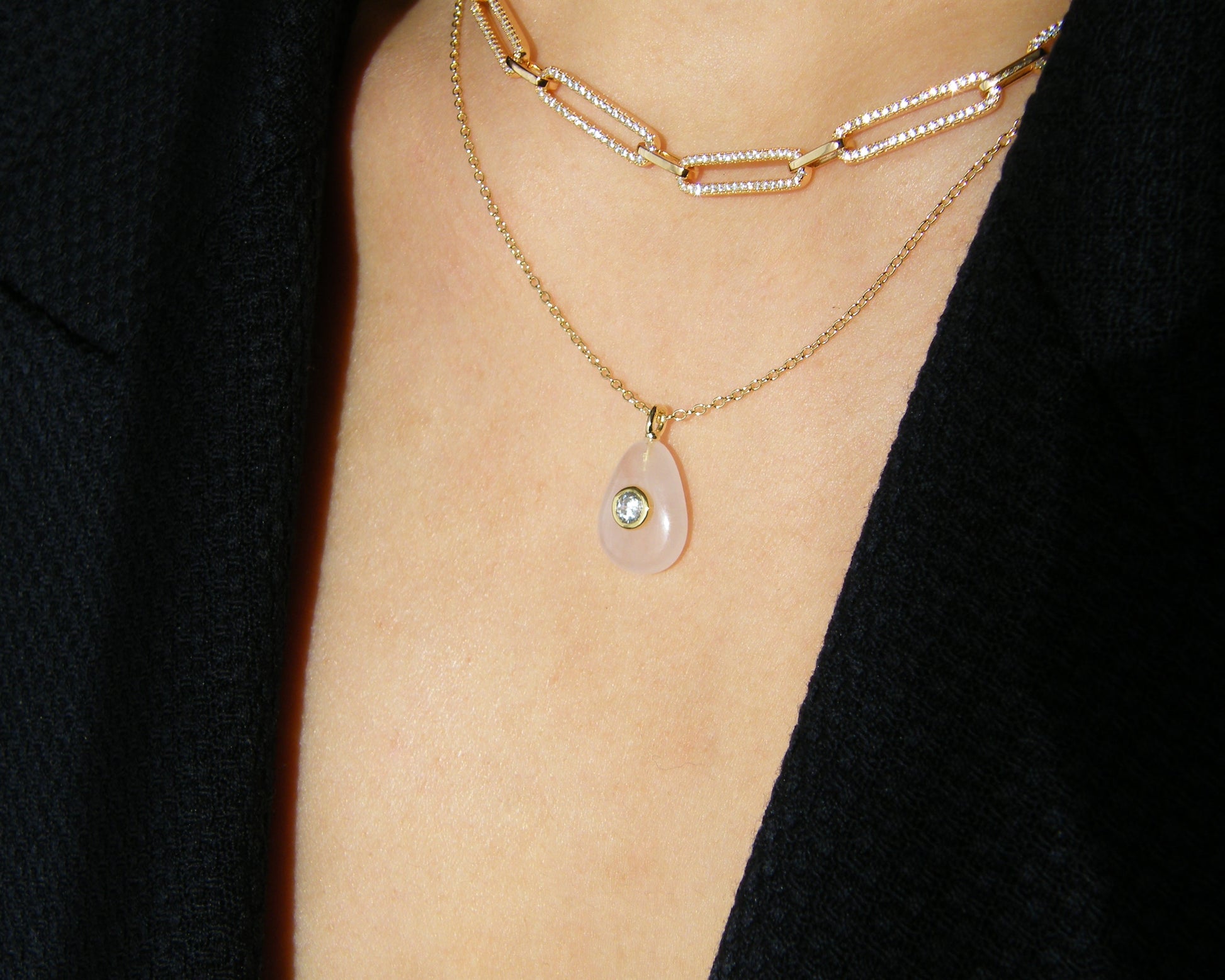 Delicate and romantic, the Aura Rose Quartz Necklace brings a soft glow to any look. Crafted in 925 sterling silver with an 18ct gold-plated finish, the pear-shaped rose quartz pendant is accented by a sparkling cubic zirconia at its centre for a modern touch.
