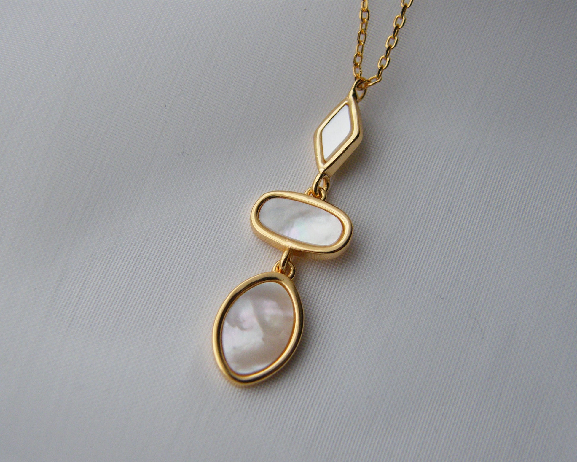 A luminous statement of elegance, the Aurora Cascade Necklace features a trio of radiant mother-of-pearl drops, each delicately framed in 18ct gold vermeil over 925 sterling silver. Designed to lengthen the neckline and catch the light with every movement, this cascading pendant brings refined sophistication to any look.