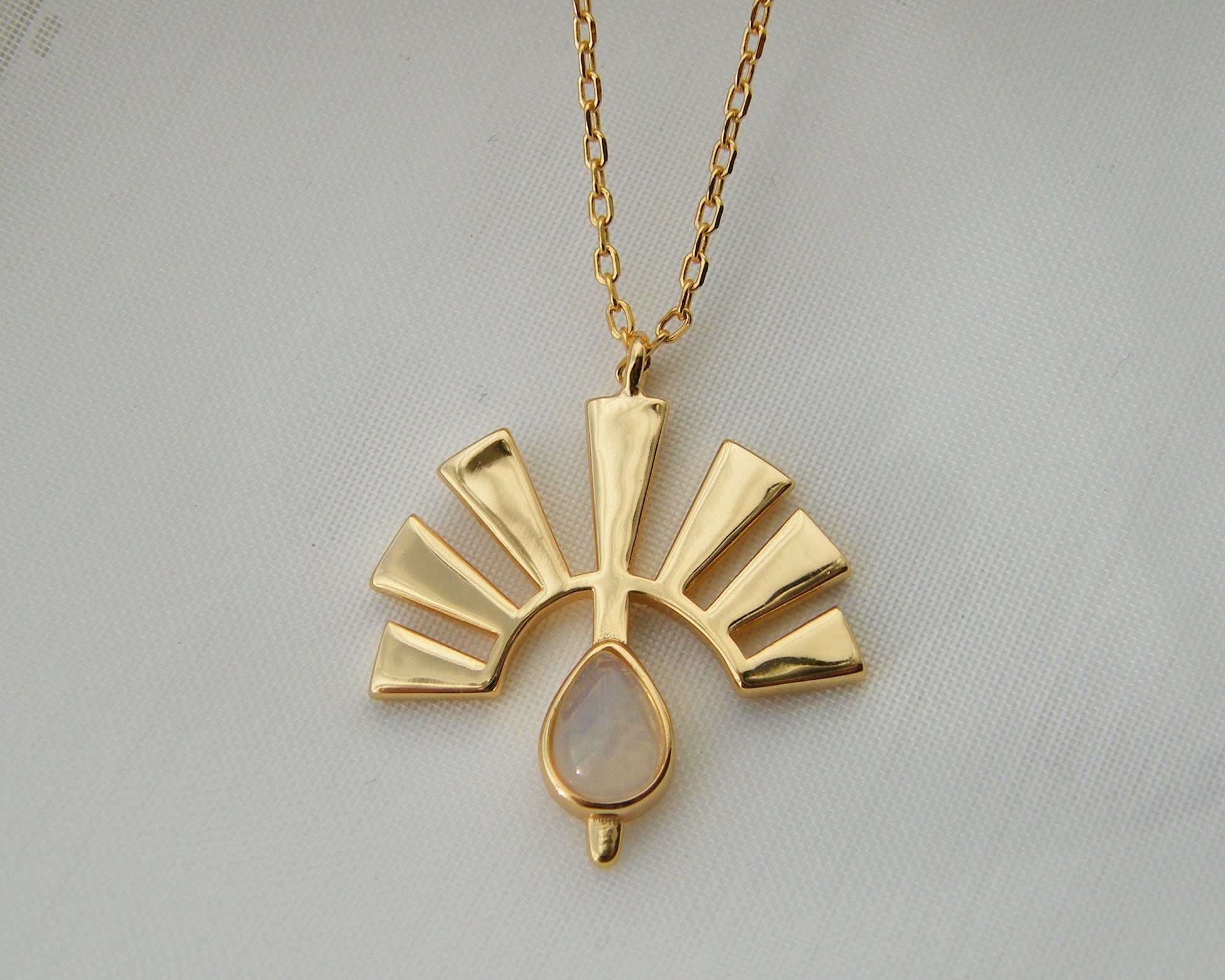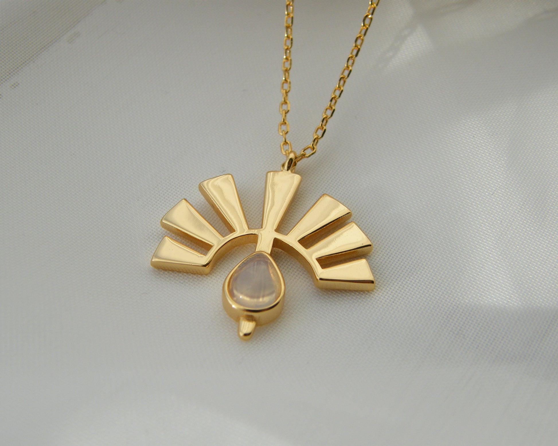 Rise, shine, and glow — the Dawn Opalite Necklace captures the quiet beauty of first light. A fan-shaped golden ray motif meets a soft teardrop of opalite, creating a pendant that feels both modern and meaningful.