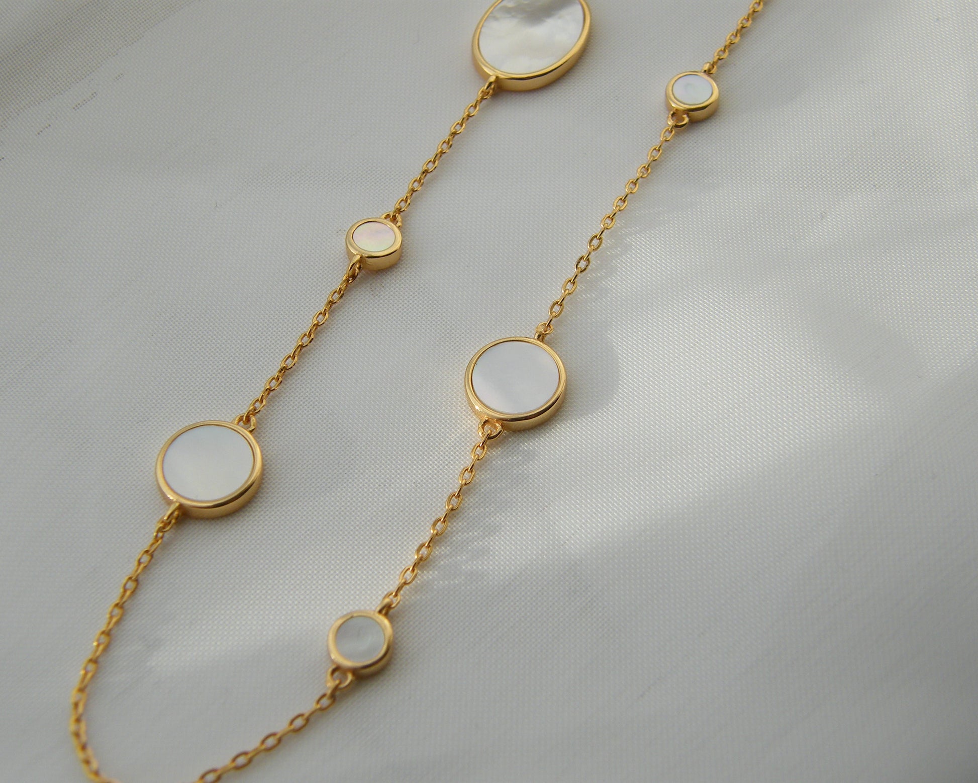 Light, luminous and effortlessly refined — the Elysian Necklace is designed for those who love understated elegance. Featuring a graceful sequence of hand-cut mother-of-pearl stations, each bezel-set in warm 18ct gold vermeil, it softens and brightens the neckline with its natural iridescence.