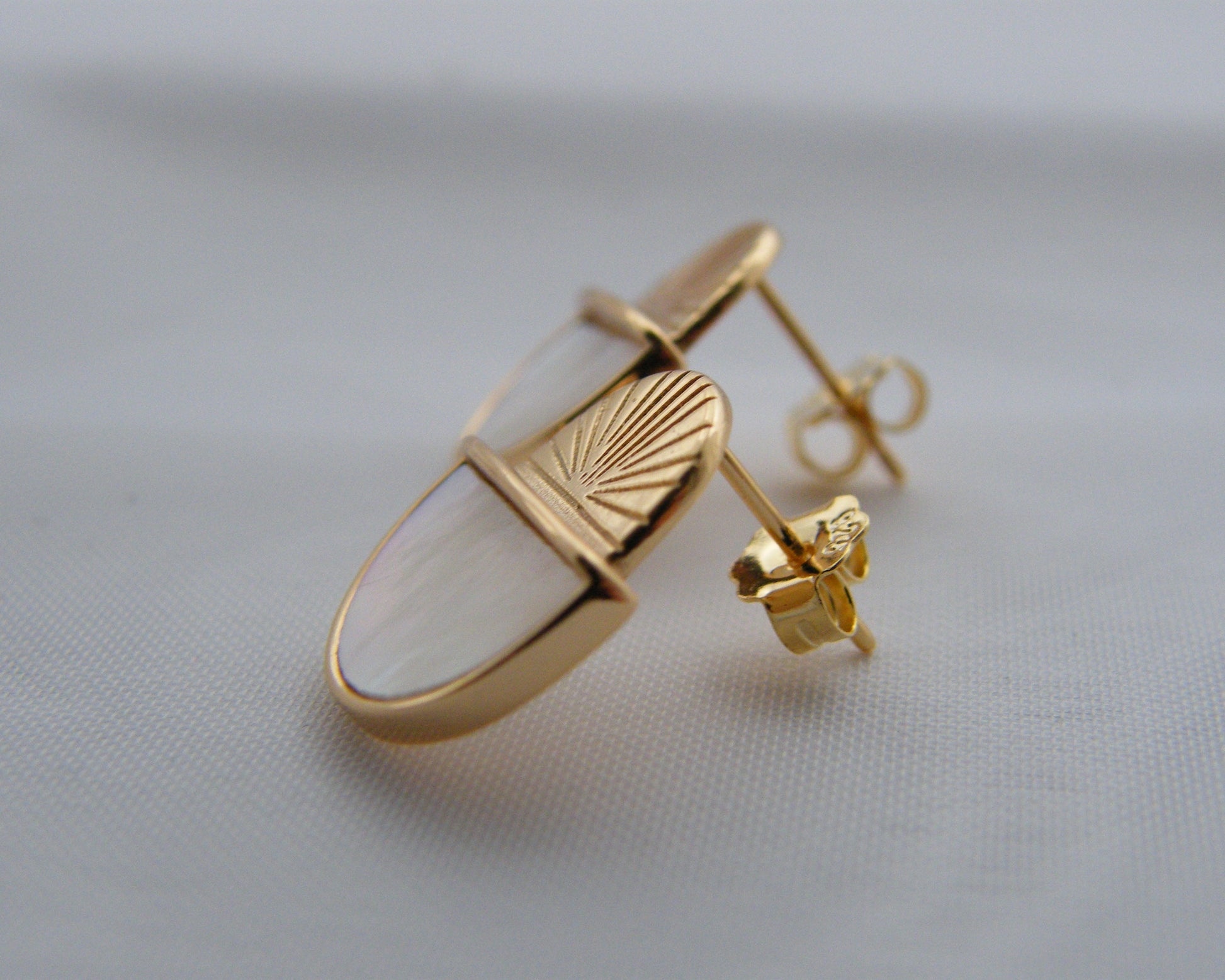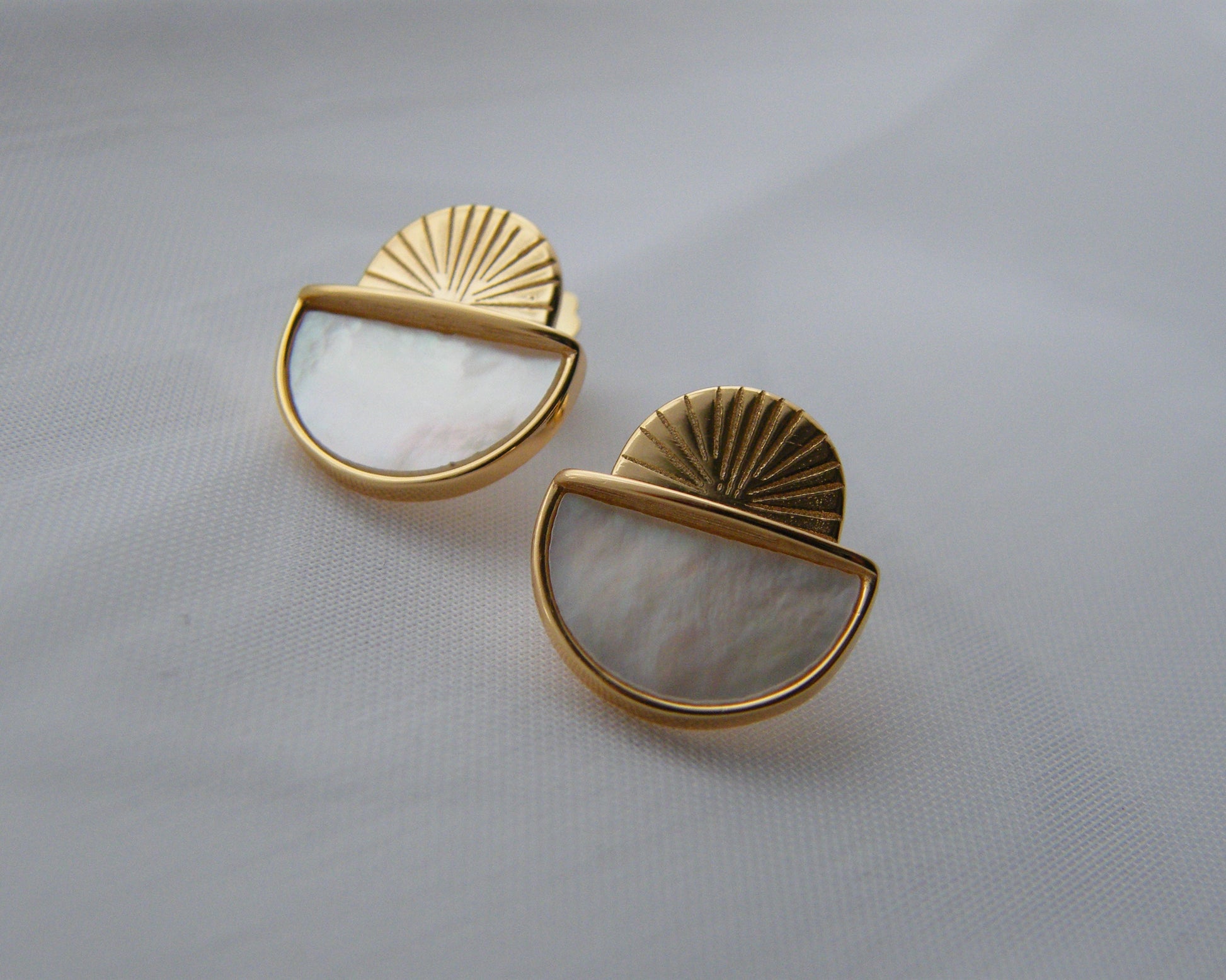 A celebration of light and balance, the Eos Studs blend timeless elegance with a modern celestial edge. Crafted from 925 sterling silver and finished in 18ct gold vermeil with a protective e-coating, each earring features a luminous half-moon of Mother of Pearl resting below a radiant engraved sunburst.