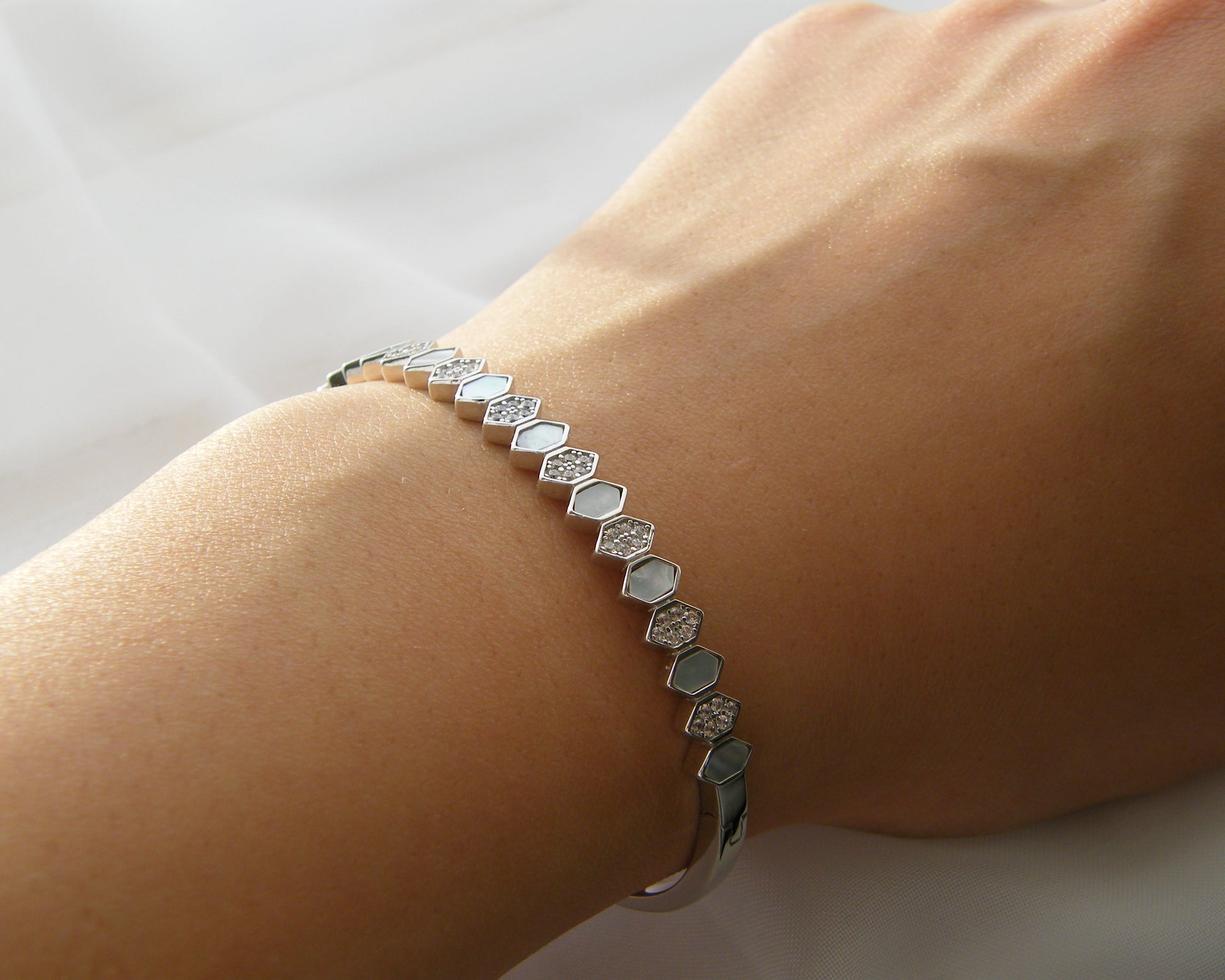 Elevated elegance meets timeless craftsmanship in the Luna Hex Set. This beautifully coordinated bangle and ring duo features alternating hexagonal designs set with luminous mother of pearl and pavé-set cubic zirconia — a striking balance of modern geometry and classic sophistication.