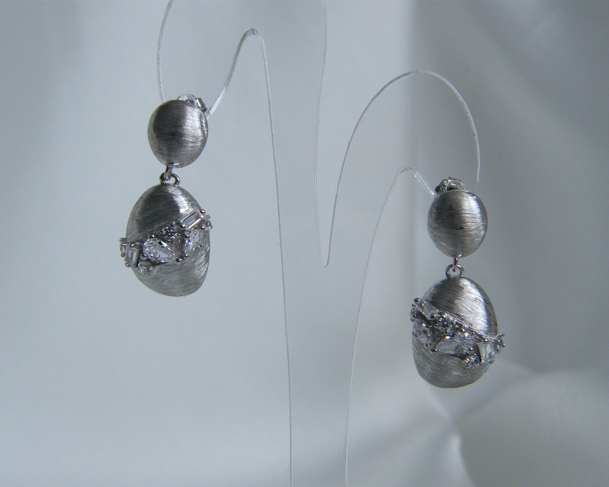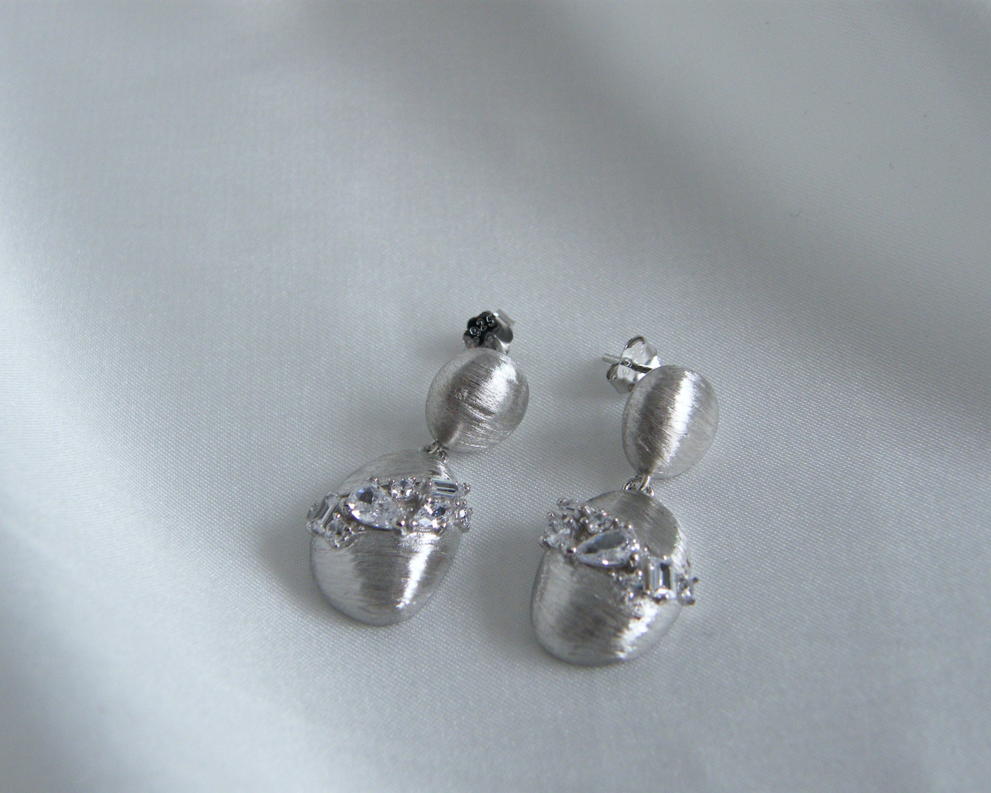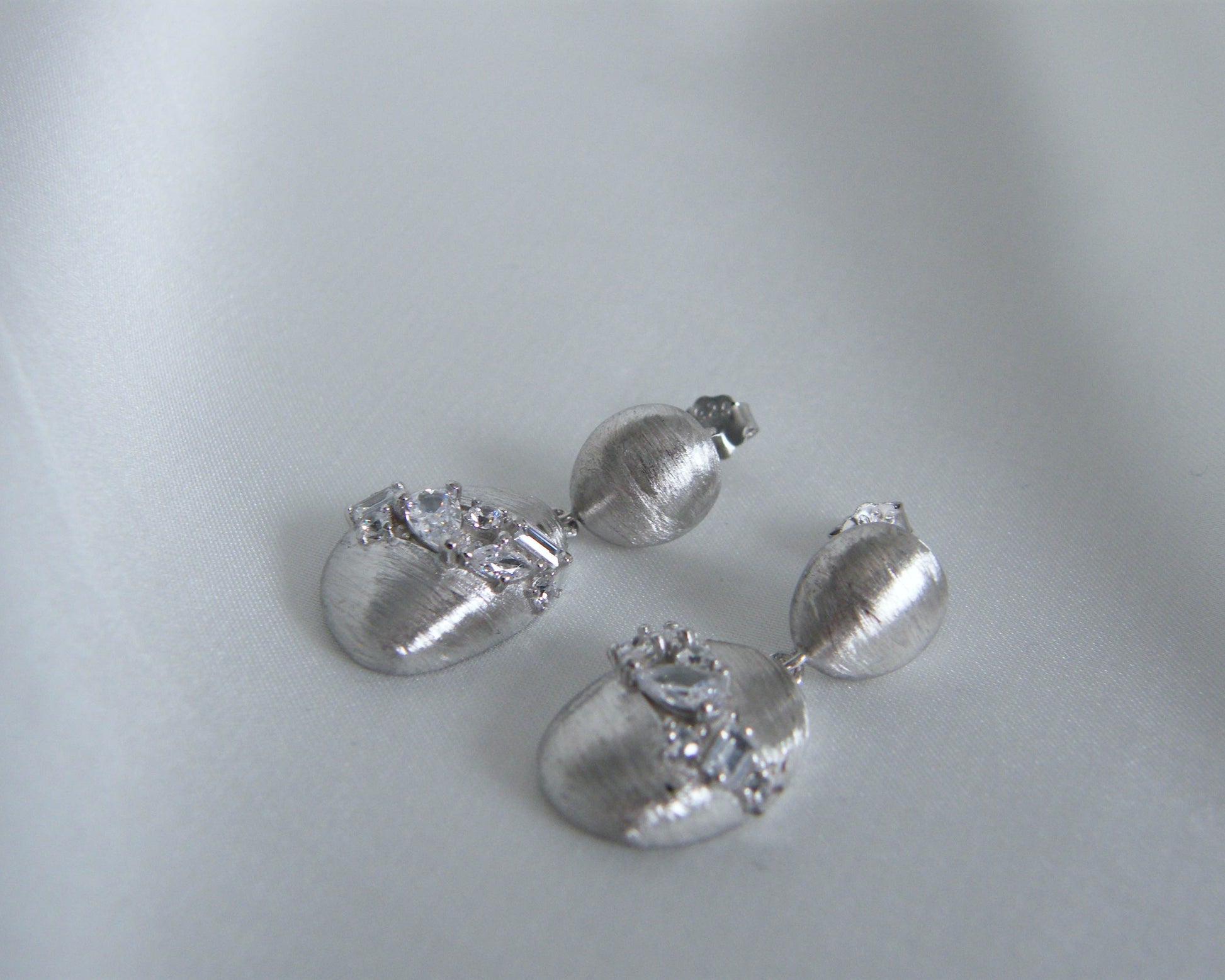 Elegant and sculptural, these drop earrings combine modern texture with timeless sparkle. Crafted from solid 925 sterling silver, they feature a luxurious brushed finish and are adorned with a striking arrangement of high-grade cubic zirconia stones in various cuts for maximum brilliance.