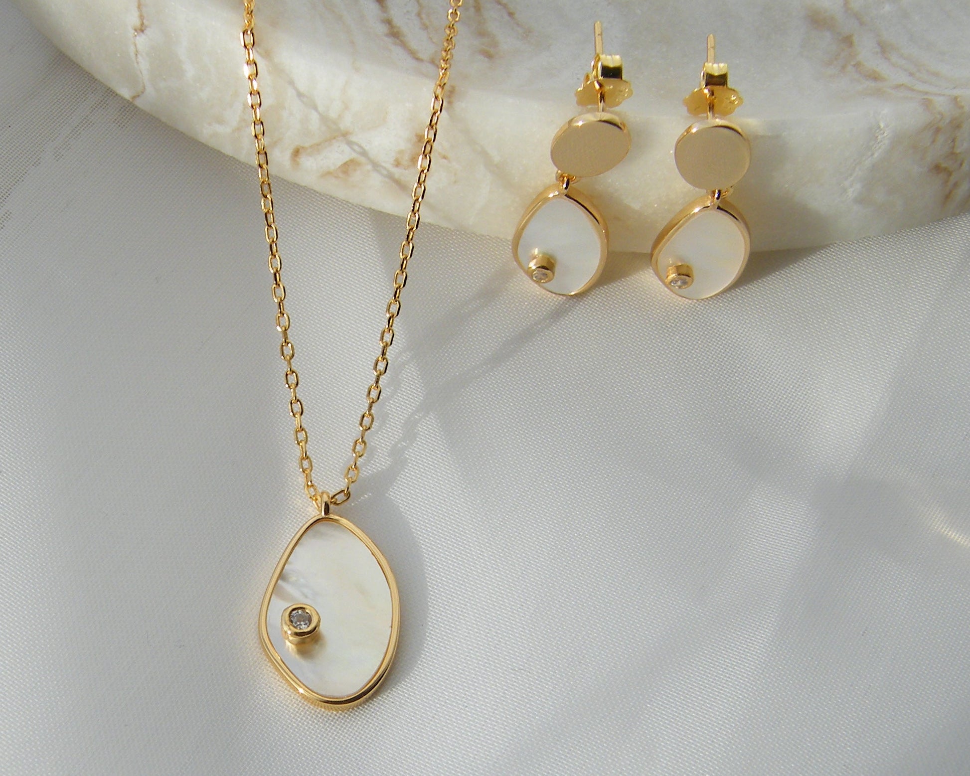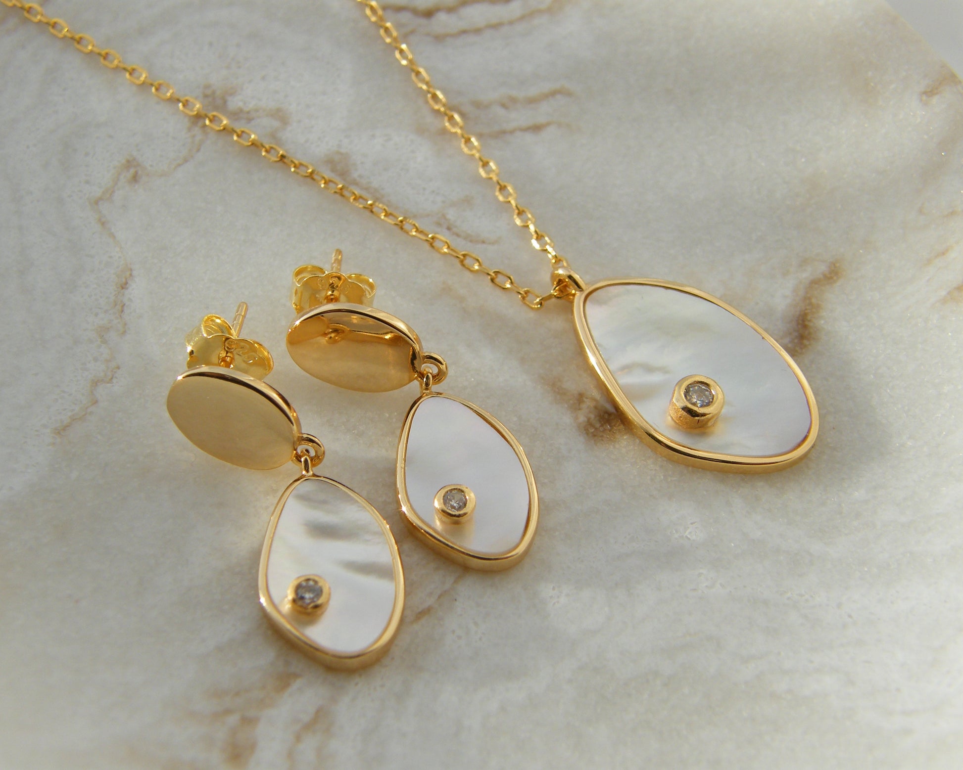 Soft, feminine, and quietly luxurious — the Lyria Drop Necklace brings together luminous mother of pearl and a bezel-set cubic zirconia in a modern teardrop silhouette.