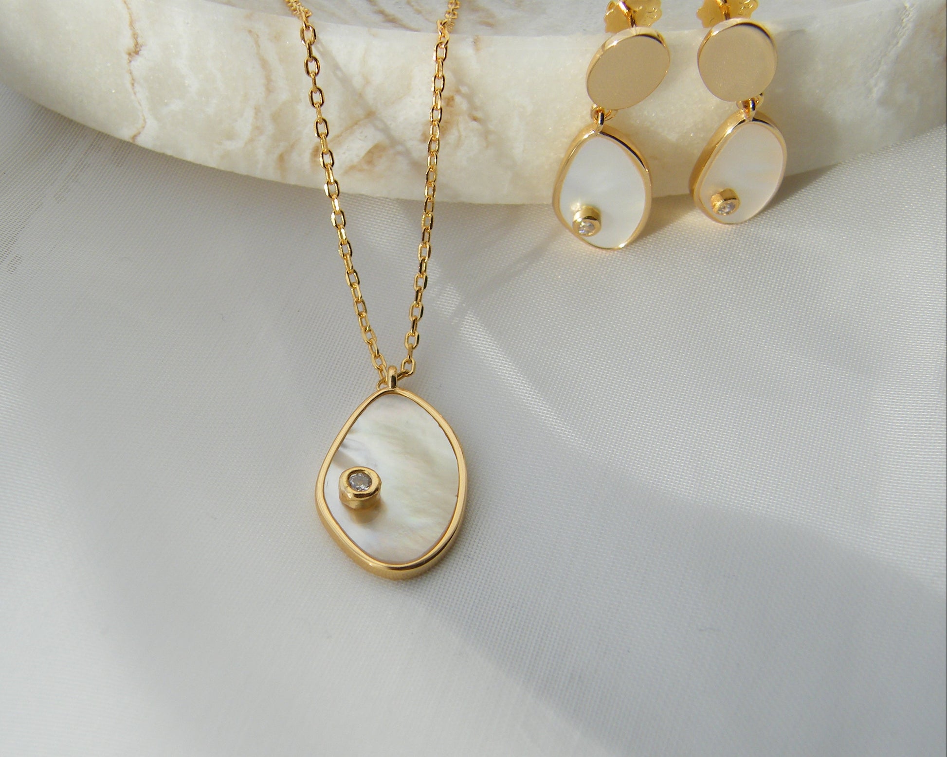 The organic shape of the pendant gives each piece a natural, effortless feel, while the smooth gold-vermeil frame adds a touch of refined polish. Suspended from a delicate 16–18 inch adjustable chain, it sits beautifully at the collarbone — perfect for everyday elegance or layering with your favourite pieces.