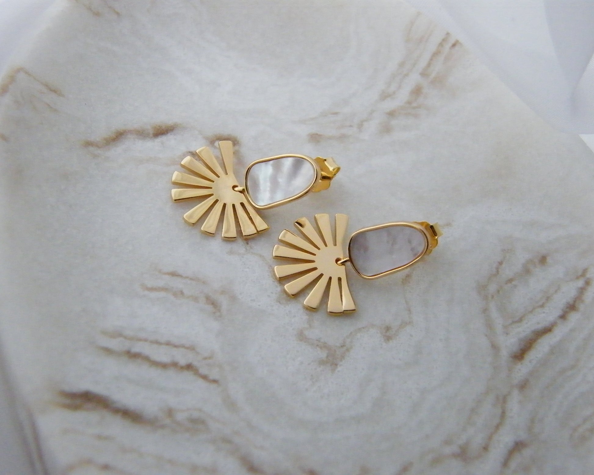 Refined yet radiant, the Solstice Mother of Pearl Earrings bring a touch of luminous elegance to any occasion. Designed with the same sculptural fan motif as the matching necklace, each earring features a smooth mother of pearl framed in 18ct gold vermeil — glowing softly with every movement.